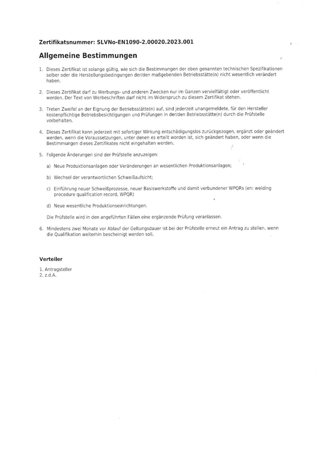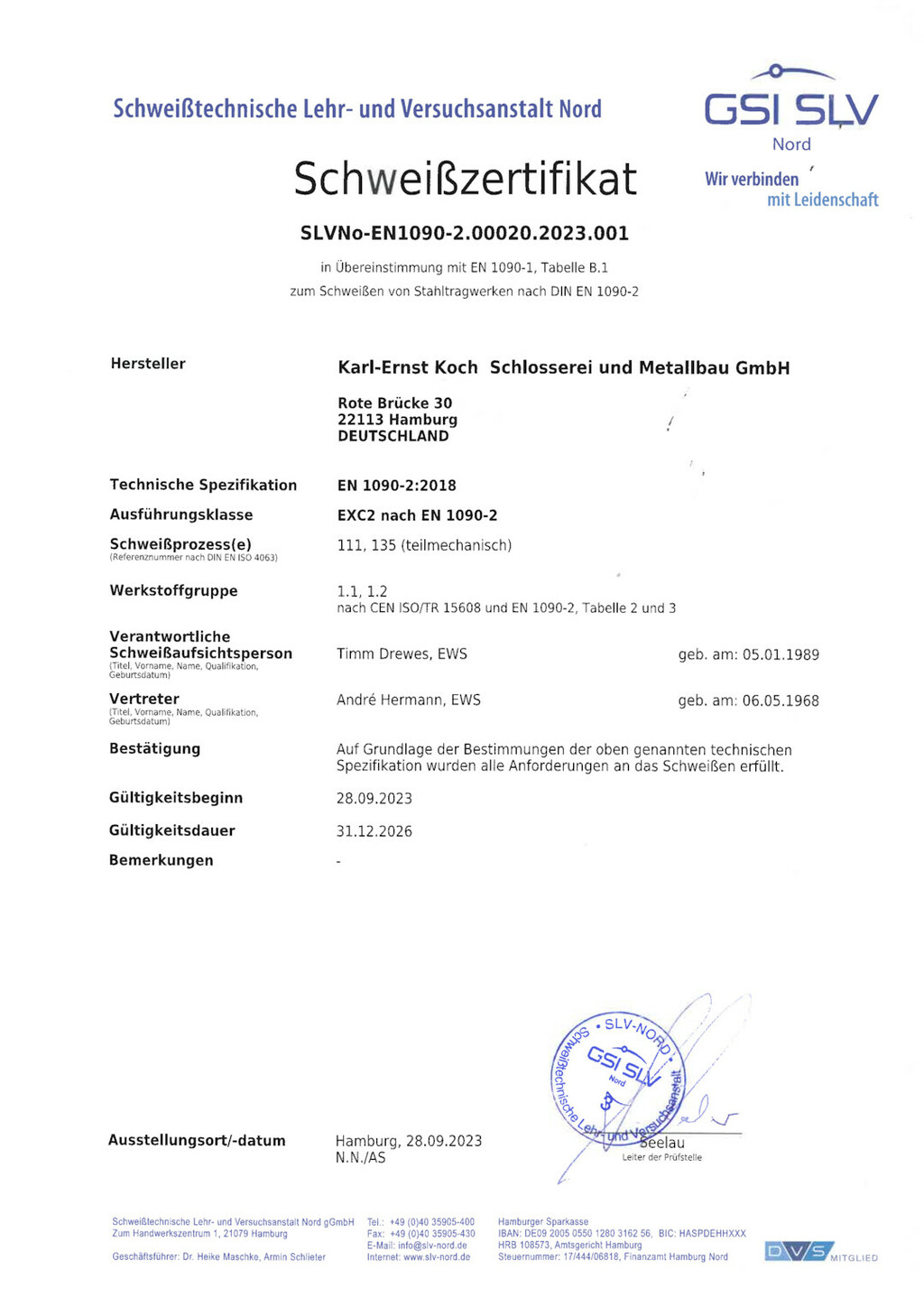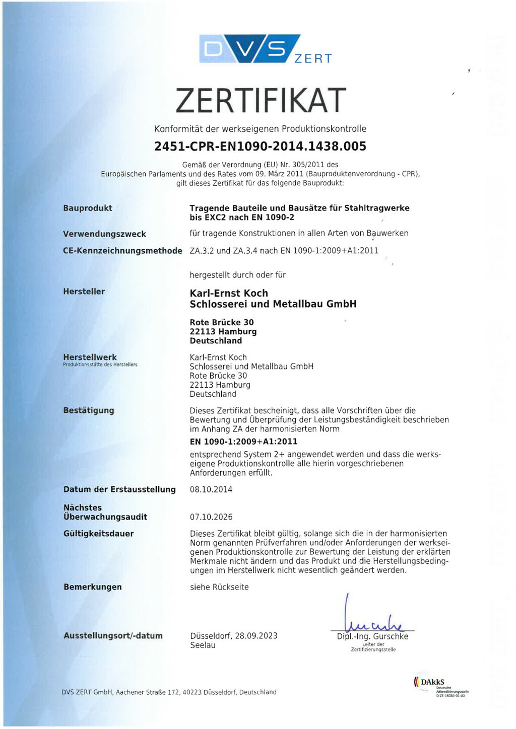 Tradition bedeutet für uns keinen Stillstand, sondern Weiterentwicklung und Fortbildung. Deshalb sind wir auch Ihr kompetenter Ansprechpartner als Schweißfachbetrieb gemäß der neuen DIN EN1090 bis zur Ausführungsklasse 2 für tragende Konstruktionen. Gerne realisieren wir Ihre Projekte gemäß dieser Norm.